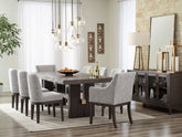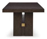 Dressed to thrill, this simply stunning dining table offers a high-design look at a down-to-earth price. Ultra sleek lines are accentuated with a dark waxy brown oak-tone finish that’s so easy on the eyes. Clean-lined and modern, the double pedestal base and thick edge tabletop showcase quality craftsmanship and attention to detail. Whether you're hosting family meals or holiday entertaining, it has a timeless look that’s made to last.
