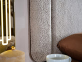 Upholstered headboard and bed frame finished in soft beige fabric.
