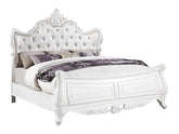 • Highly decorative, tufted platform bed frame in white—no box spring required