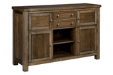 The Moriville Grayish Brown Dining Server brings rustic charm and practical storage to your dining space. Designed with a warm grayish brown finish, this server showcases a beautifully textured wood-grain look that complements farmhouse and transitional interiors. Its spacious top surface is perfect for serving dishes or displaying décor, while the combination of cabinets and drawers provides organized storage for dining essentials. Whether used for entertaining or everyday organization, this piece adds both style and functionality to your home.