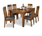 - Includes extension dining table and 6 upholstered rake-back chairs