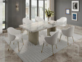 The Charity 6 Person Dining Room Set includes a rectangular fixed-top dining table and six upholstered chairs (typically with two armchairs and four side chairs) — a full 7-piece ensemble designed to seat up to 6 people comfortably. It uses a neutral Light Gray upholstery color option and is priced at approximately USD 2,599