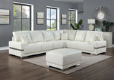 The sectional is supported by silver-tone chrome plate legs and trimmed with silver metal accents, adding a polished, chic touch to the immaculate frame. Bold track arms and a rectangular ottoman further enhance the modern look, giving the sectional a stylish edge. With a modular design, you have the freedom to mix and match pieces, allowing you to tailor the sofa to fit your space and style preferences.