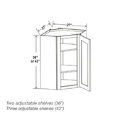 Our 27″ Gray Shaker Diagonal Corner Wall Cabinet is 27″ wide, 12″ deep, and available in 2 heights – 36″, and 42″.