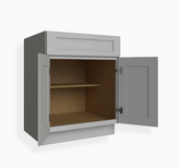 Our Gray Shaker Base Cabinet with Double Doors is 34.5″ tall, 24″ long, and available in 2 widths (24″, 27″).