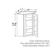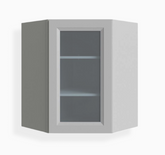 Our 24″  Gray Shaker Diagonal Corner Wall Cabinet with Glass Door is 24″ wide, 24″ deep, and available in 3 heights – 30″, 36″, and 42″.