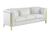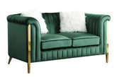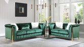 Add a splash of sophistication to your home with the Fara Sofa and Loveseat by NEW ERA FURNITURE. Upholstered in velvet with stunning gold legs, this set offers both luxurious comfort and a chic, modern design. Available in a beautiful Cream-Green color, it brings a refined yet cozy feel to any space.