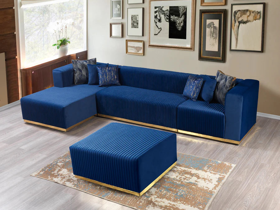 The Juliana Blue Velvet 4-Piece Sectional features vertical channel tufting, adding a touch of visual intrigue and depth. This tufting technique not only enhances the sectional's aesthetic appeal but also provides a luxurious texture that you'll love sinking into. The golden finish adds a glow to your space. The item comes with six designer pillows.