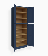 Our Navy Blue Shaker 18″ W Utility Pantry Cabinet is 30″ Wide, 24″ Deep, and available in 3 heights. This Pantry Cabinet features 2 adjustable top shelves and 3 bottom shelves.