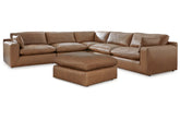 The Emilia Caramel Leather 5-Piece Sectional by Signature Design by Ashley offers sophisticated design and flexible comfort. Featuring warm caramel leather-match upholstery, feather-fiber back cushions, and bolster pillows, this U-shaped sectional creates an inviting lounge space with modular versatility.