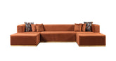 The Juliana Blue Velvet 4-Piece Sectional features vertical channel tufting, adding a touch of visual intrigue and depth. This tufting technique not only enhances the sectional's aesthetic appeal but also provides a luxurious texture that you'll love sinking into. The golden finish adds a glow to your space. The item comes with six designer pillows.