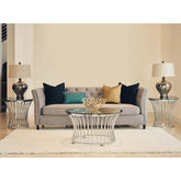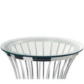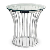 This end table is the accent piece your living space has been missing! This end table features a modern glam design, instantly adding a dash of luxury to your home. The glass tabletop pairs perfectly with the chrome finish, making this end table easily transitional with any space. The intricate work on the table base adds an element of drama and flair. This living room staple is perfect for small space living thanks to its tall and narrow design. Add this end table to your living space today for an ultra-glam look!