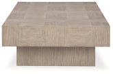The Jorlaina Coffee Table by Ashley (Signature Design) brings together a transitional flair and versatile style. With a textured light-grayish brown finish over wire-brushed oak veneer, this rectangular coffee table paired with a double-plinth base provides a balanced look that fits both traditional and modern living spaces.