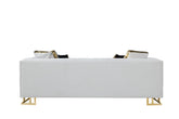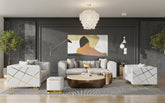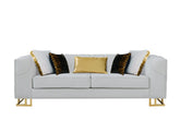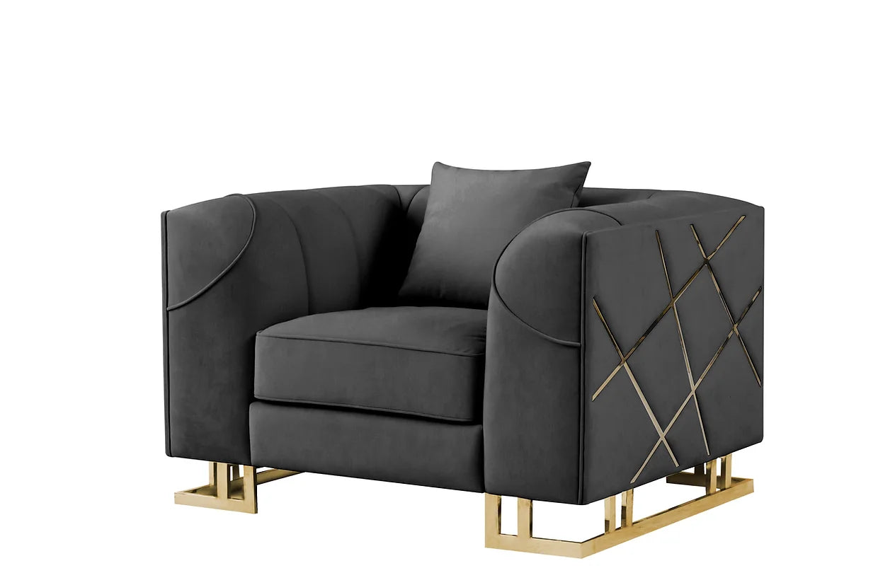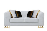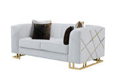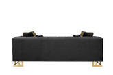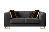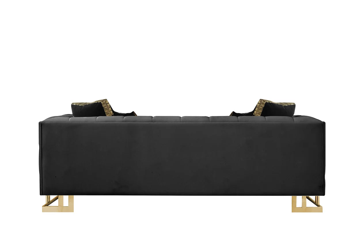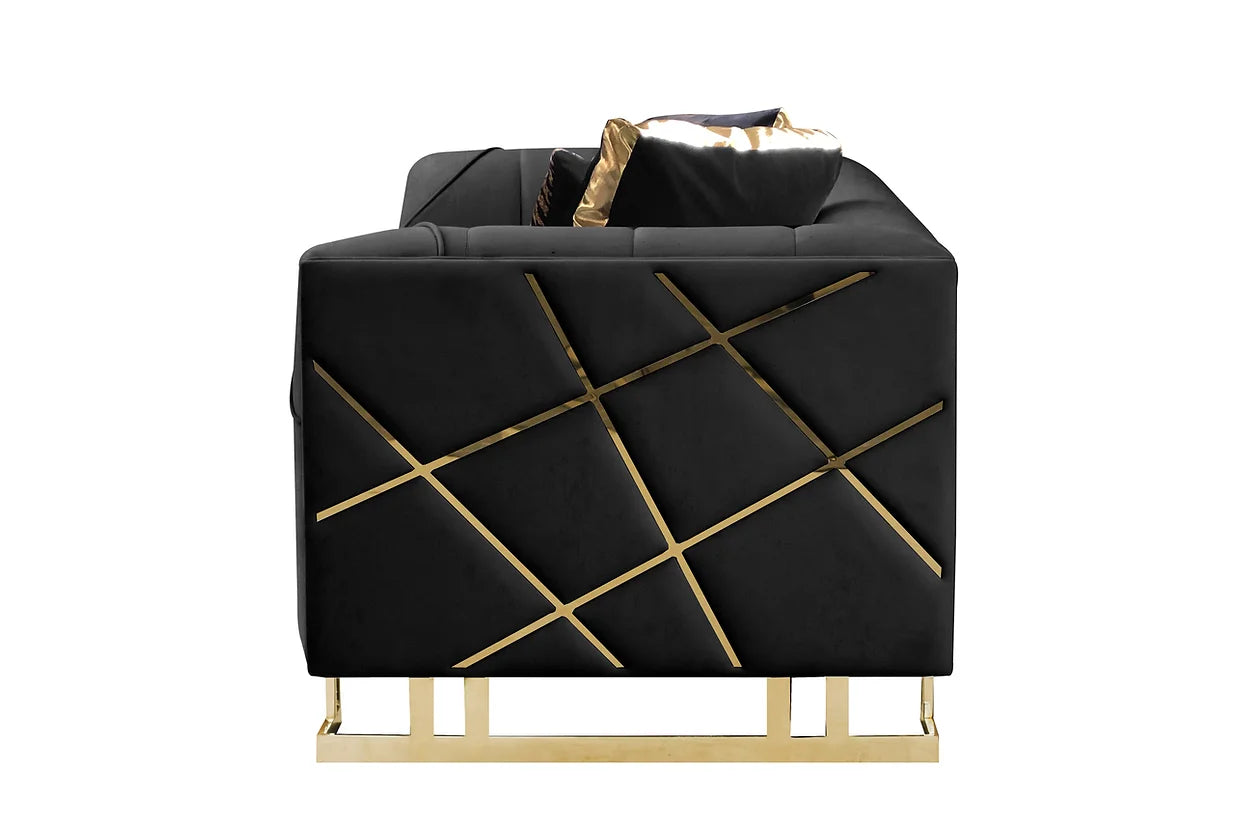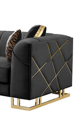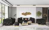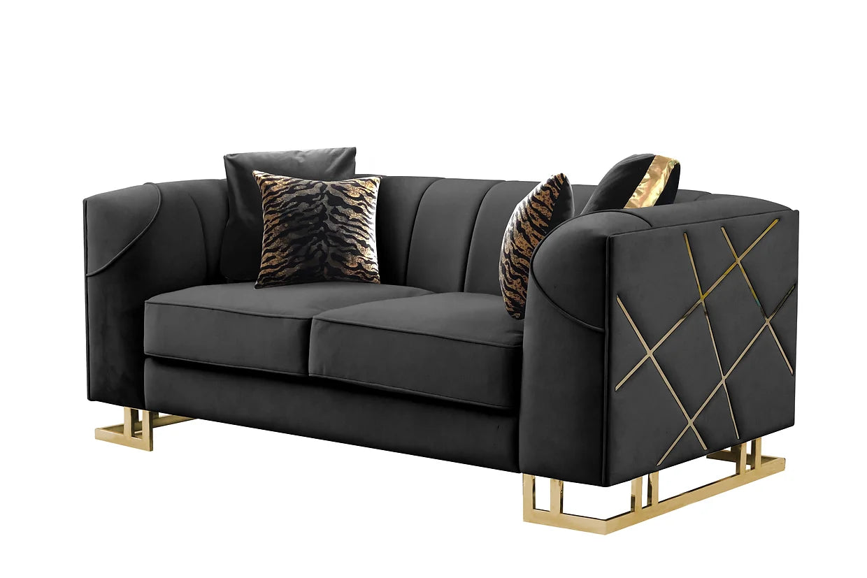 Renueva tu sala de estar con el lujoso conjunto de sofá y loveseat de diseño de New Era Furniture. Esta impresionante colección presenta una elegante tapicería de terciopelo negro adornada con elegantes detalles dorados, que ofrece estilo y comodidad.