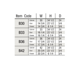Dimensiones del gabinete: 30″ de ancho x 34-1/2″ de alto x 24″ de profundidad, 33″ de ancho x 34-1/2″ de alto x 24″ de profundidad, 36″ de ancho x 34-1/2″ de alto x 24″ de profundidad, 42″ de ancho x 34-1/2″ de alto x 24″ de profundidad