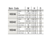 Dimensiones del gabinete: 36″ de ancho x 34 1/2″ de alto x 21″ de profundidad, 42″ de ancho x 34 1/2″ de alto x 21″ de profundidad, 48″ de ancho x 34 1/2″ de alto x 21″ de profundidad