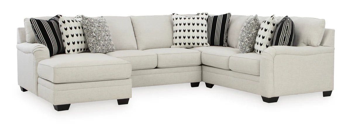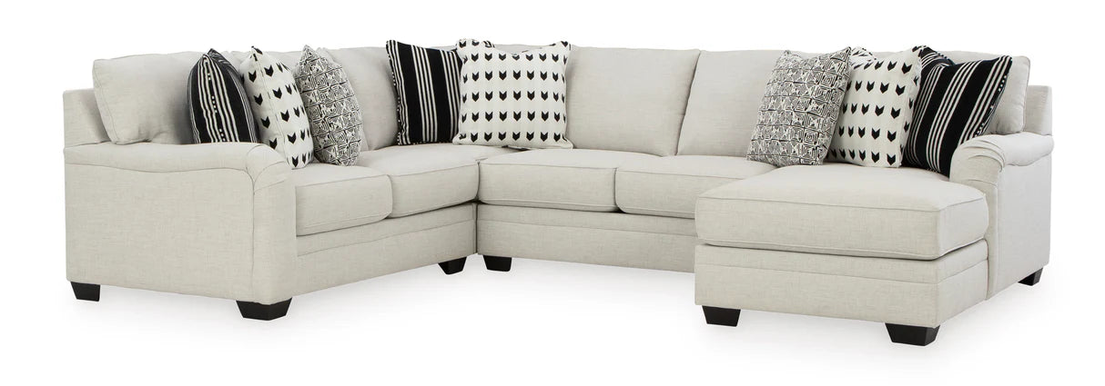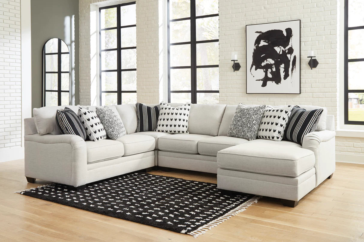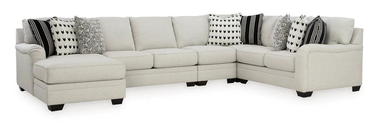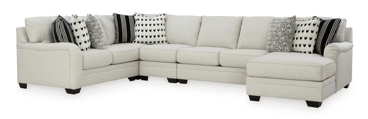 Bring classic farmhouse charm to your living space with the Huntsworth Sectional Collection. Inspired by traditional English countryside motifs, this collection combines deep, inviting seating with modern farmhouse style. The sectional is upholstered in soft dove gray chenille, providing a neutral, versatile base for a variety of décor styles. Available in 2-, 4-, and 5-piece configurations with both left-arm facing (LAF) and right-arm facing (RAF) chaise options, this collection adapts perfectly to your space. Plush, reversible seat cushions, attached back cushions, and accent pillows with feather-fiber fill enhance comfort, while exposed faux wood feet add subtle elegance. The platform foundation system resists sagging three times better than traditional spring systems, keeping a smooth, wrinkle-free appearance over time.