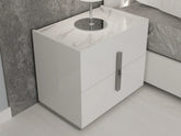 Acabado en laca blanca de alto brillo con detalles de efecto mármol.
