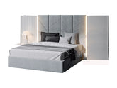 • Cama tipo plataforma con cabecero tapizado en tela en gris acero París sobre un acabado blanco mate.