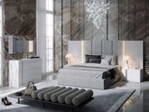 El conjunto de dormitorio Helen es una colección moderna y contemporánea con acabados en gris claro y blanco . Desarrollado por ESF Furniture (fabricado en España), el conjunto se ofrece en tamaños Queen o King y en configuraciones modulares: 3 piezas (cama + 2 mesitas de noche) o 5 piezas (incluye cómoda y espejo).