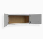 Nuestro gabinete de pared simple Shaker gris de 15″ tiene 12″ de alto y está disponible en 3 anchos (30″, 33″, 36″).