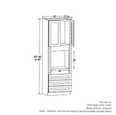 Nuestro gabinete de despensa para horno Shaker blanco de 84 cm de ancho mide 84 cm de ancho y 61 cm de profundidad, y está disponible en 3 alturas. Este gabinete cuenta con dos puertas, un estante grande abierto y tres cajones inferiores.