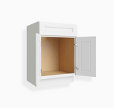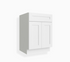 Nuestro mueble base blanco Shaker para lavabo individual mide 87 cm de alto y 53 cm de profundidad, y está disponible en dos anchos (61 cm y 68 cm). Este mueble cuenta con un cajón oculto.