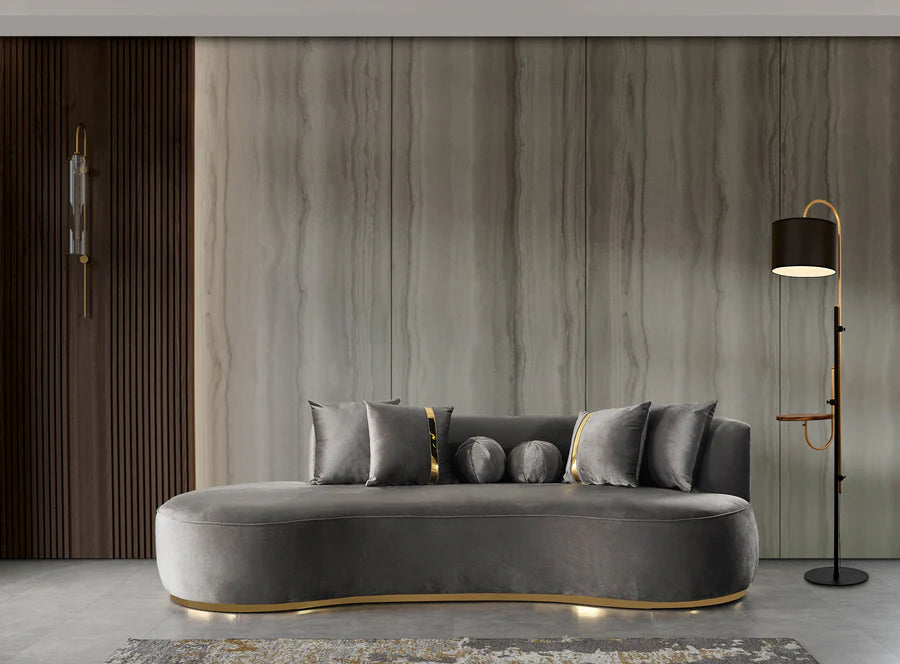 La tapicería neutra irradia una sofisticación atemporal, mientras que la base presenta llamativos detalles dorados que añaden un toque de glamour y lujo. Esta chaise longue incluye cuatro cojines cuadrados y uno redondo para mayor estilo y comodidad.