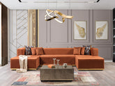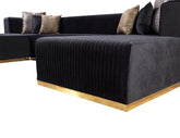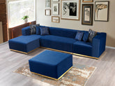 El seccional Juliana de terciopelo azul de 4 piezas presenta un capitoné con canales verticales que le aporta un toque de intriga visual y profundidad. Esta técnica de capitoné no solo realza su atractivo estético, sino que también proporciona una textura lujosa en la que te encantará sumergirte. El acabado dorado le da un toque de luminosidad a tu espacio. Incluye seis cojines de diseño.