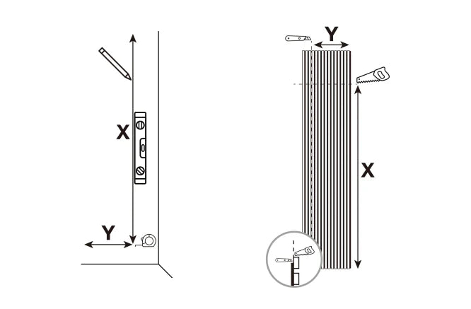 1. Mida la altura de la pared de instalación. Si necesita cortar paneles, márquelos con un lápiz y una escuadra (¡recuerde medir DOS VECES, cortar una!). Corte los paneles a la medida con una sierra de mano o una sierra circular de dientes FINOS. Si también necesita cortar los paneles a lo ancho, puede usar una cuchilla afilada para cortar el respaldo de fieltro.