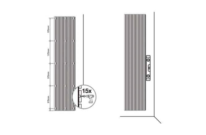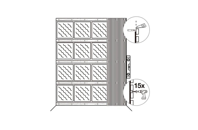 2 Marque los puntos de fijación en la superficie de instalación en 5 filas de tres, con una separación aproximada de 575 mm, y asegúrese de que los puntos de fijación exteriores estén a una distancia mínima de 50 mm del borde del panel. Taladre e inserte los elementos de fijación adecuados. Fije el panel a la superficie con tornillos negros de 35 mm.
