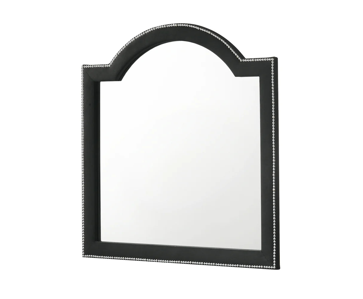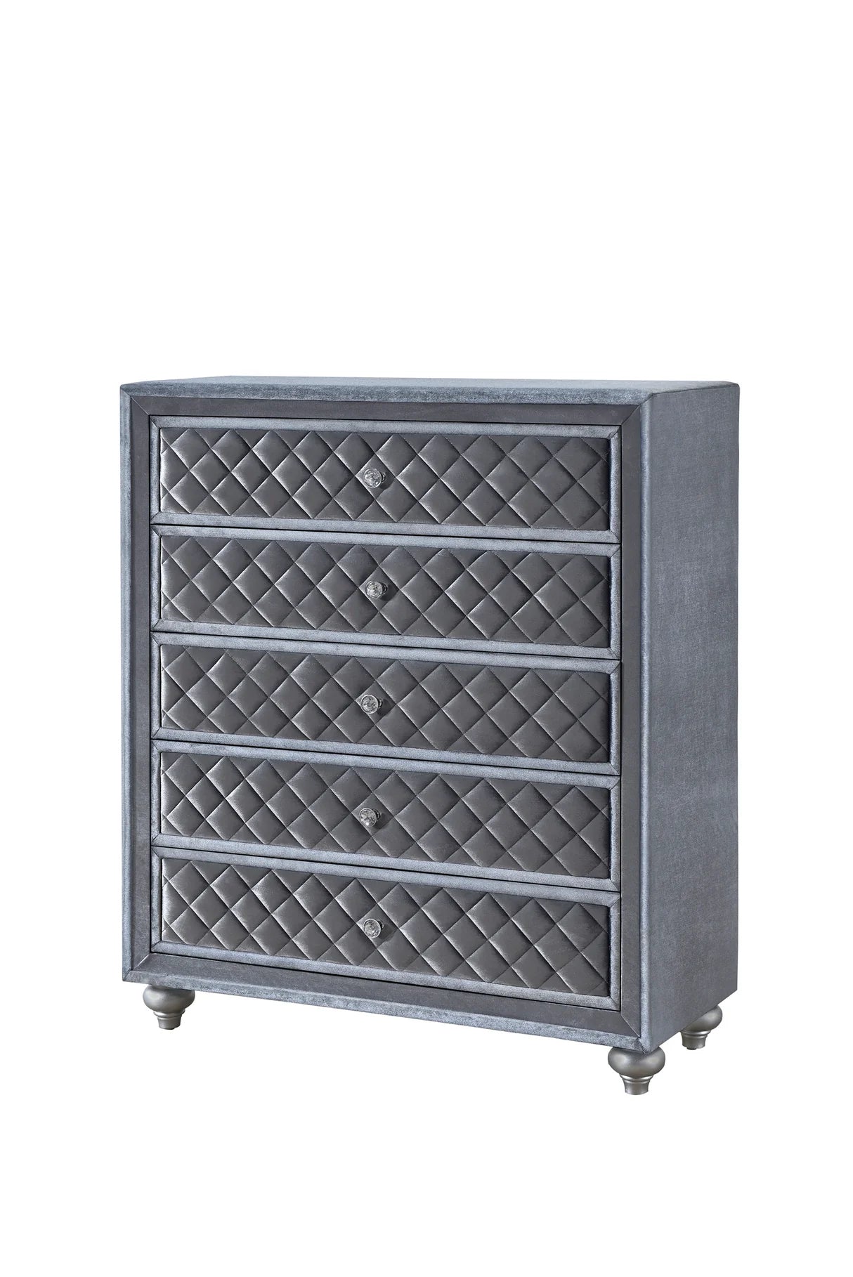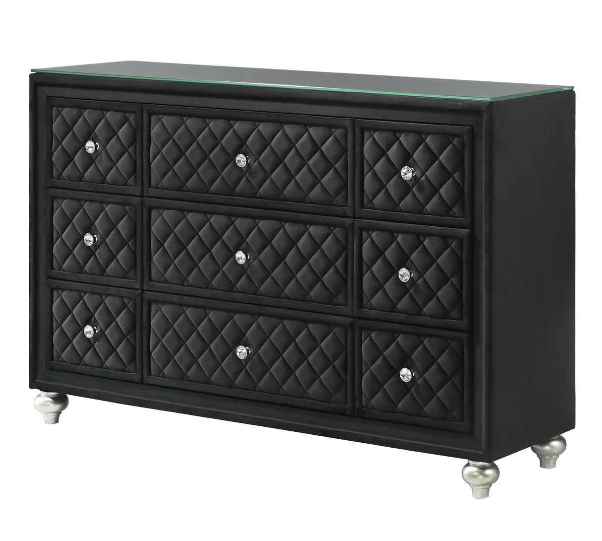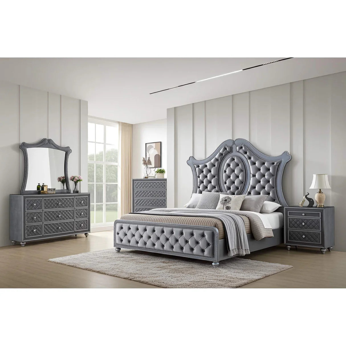Experience bold sophistication and classic glamour with the Cameo Upholstered Panel Bedroom Set. This luxurious ensemble blends dramatic, ornate curves with glamorous tufted details, wrapped in sumptuous velvet-like upholstery. Available in a sophisticated Gray or a dramatic Black, the collection features a sculptural headboard, crystal-inspired hardware, and elegant silver bun feet for eye-catching flair. Paired with functional storage pieces featuring quilted drawer fronts and tempered glass tops, this set creates a bedroom that is both opulent and practical.