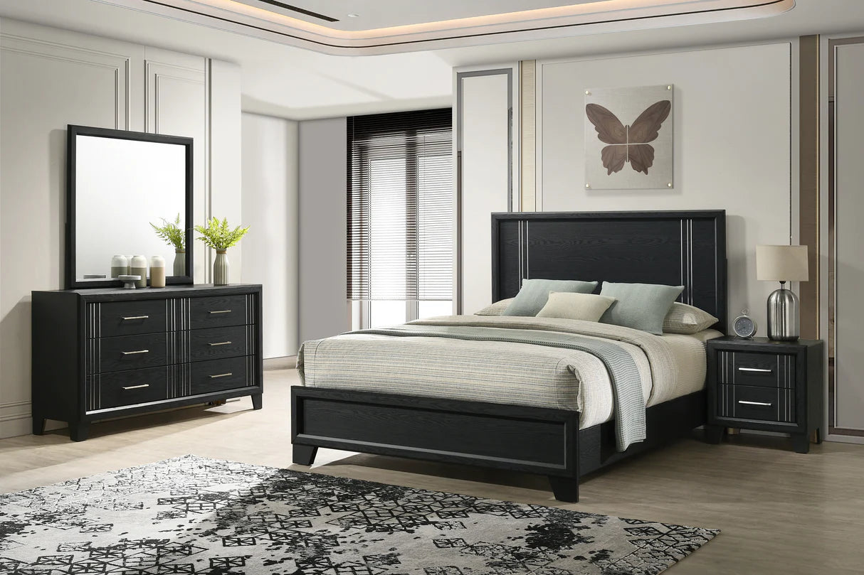 Enter a bedroom that exudes the refined calm of a luxury retreat with the Charlie Charcoal Panel Bedroom Set. Designed for serene evenings and energizing mornings, this collection offers a perfect marriage of modern sophistication and everyday function. Featuring a bold panel headboard in a deep charcoal wood grain finish, accented by sleek silver-toned hardware and decorative metal detailing, it transforms your space into an organized haven of comfort and style, seamlessly fitting urban apartments or spacious homes.