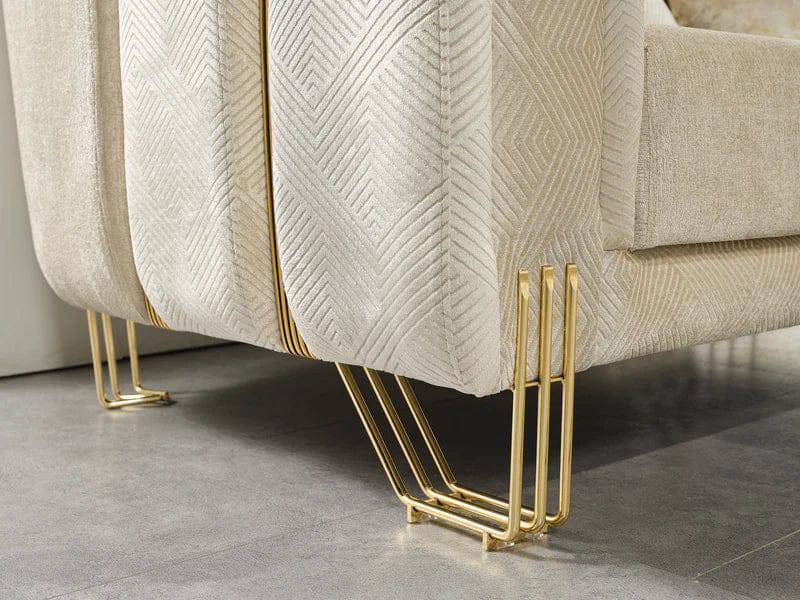 Mientras tanto, el respaldo y el asiento lucen un suntuoso terciopelo liso y sofisticado, que proporciona una experiencia de descanso suave y placentera. Ambos brazos del conjunto Santana están delicadamente envueltos por un diseño arqueado. Para realzar la estética general del conjunto, el conjunto Santana cuenta con patas doradas de acero inoxidable e incluye ocho cojines de diseño.