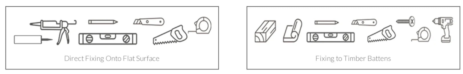 LuxeLayer recommend 45mm deep battens fixed at centres. The panels can be screw-fixed directly using black 35mm screws.