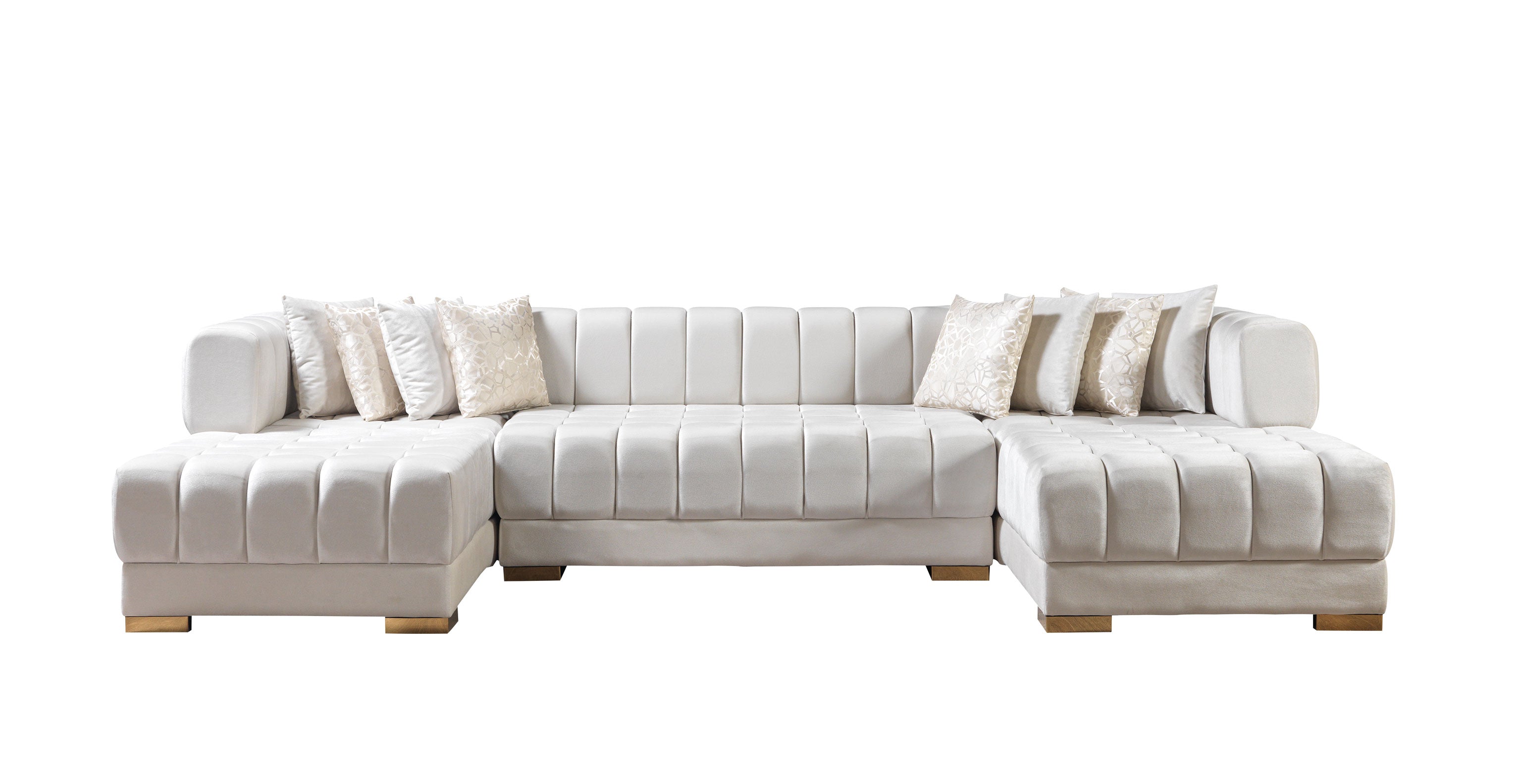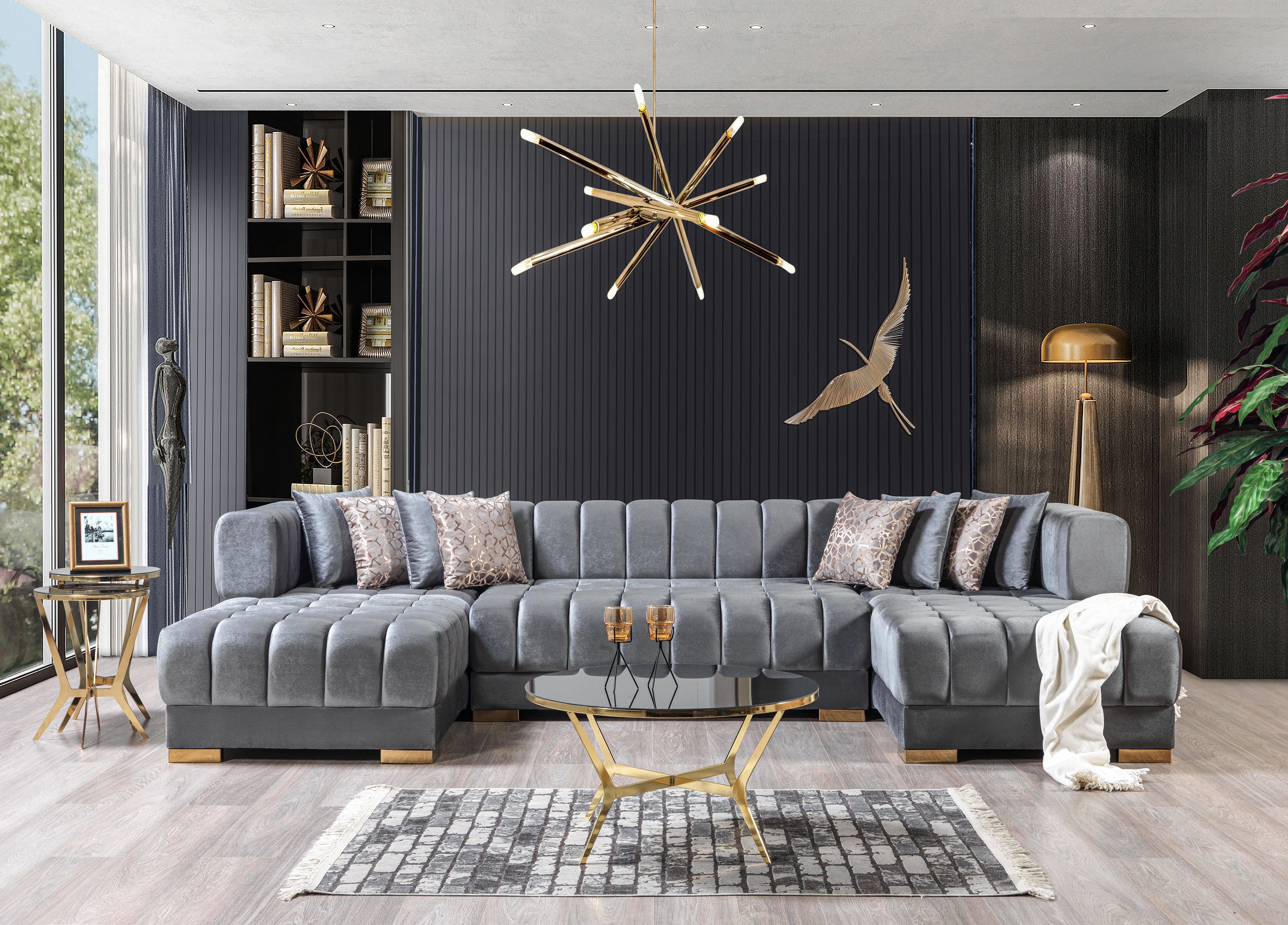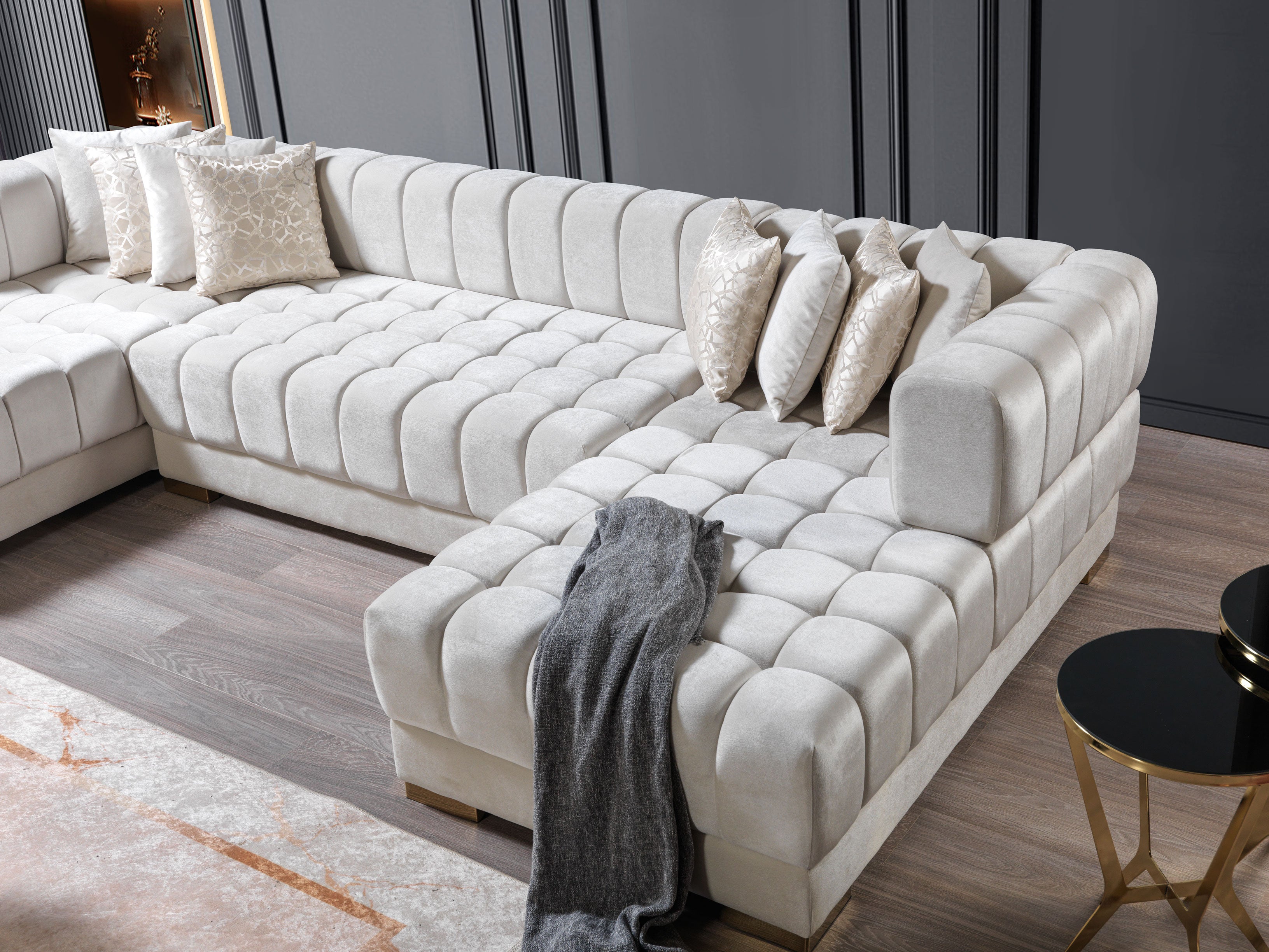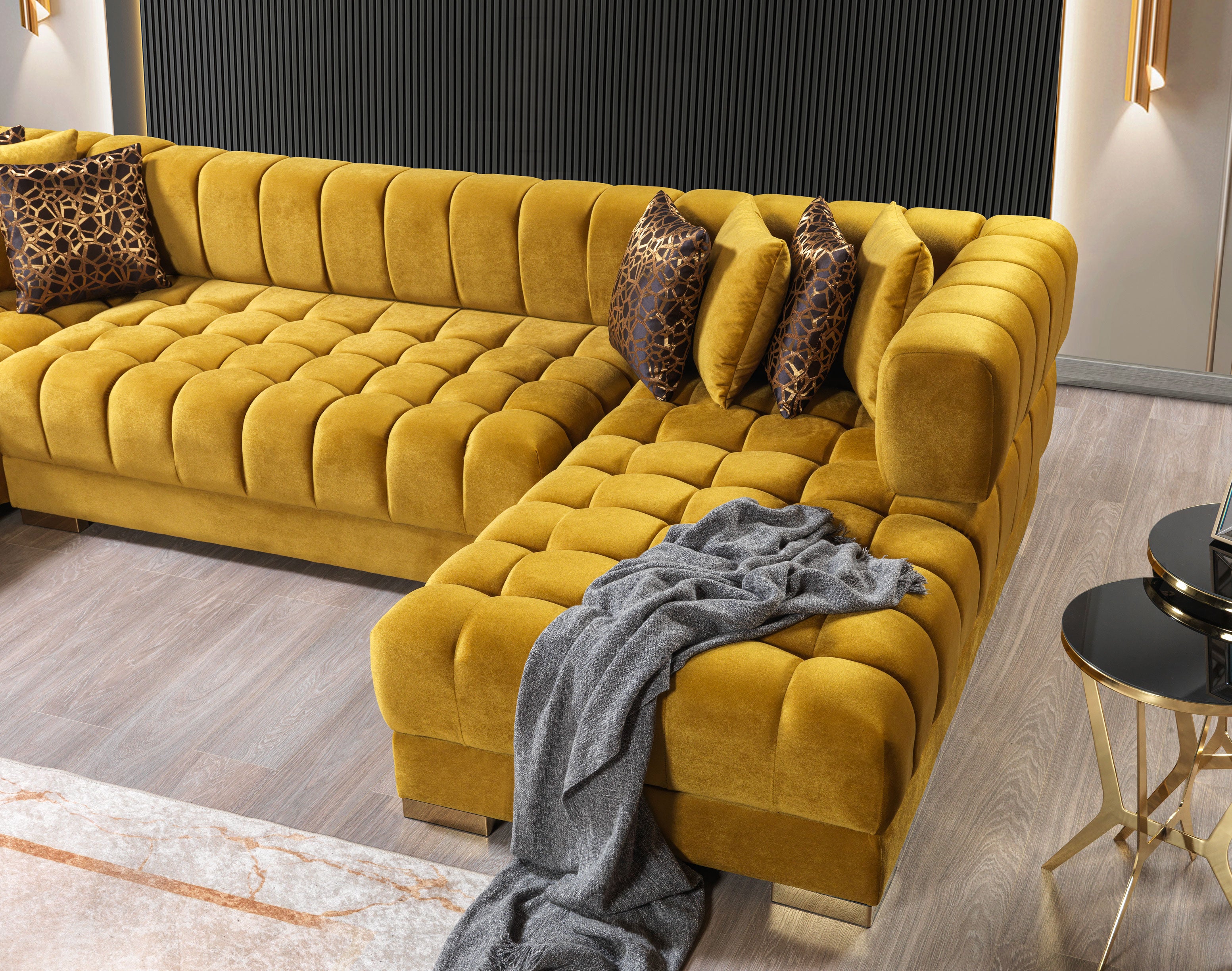Crafted from high-quality velvet fabric, Ariana delivers an irresistibly soft touch and remarkable durability, ensuring its beauty endures for years to come. Complemented by eight plush pillows, this sectional promises unmatched comfort and a sophisticated aesthetic for your living space.