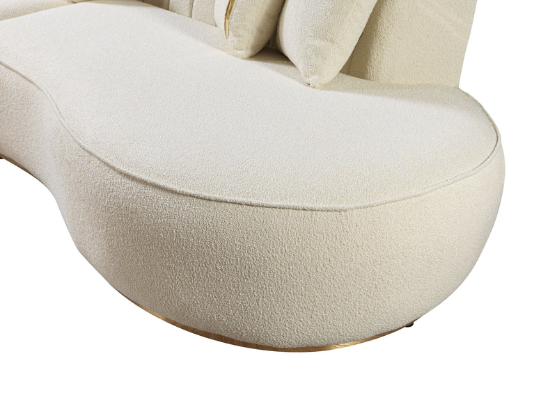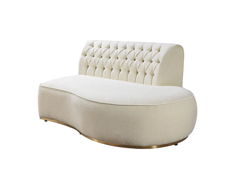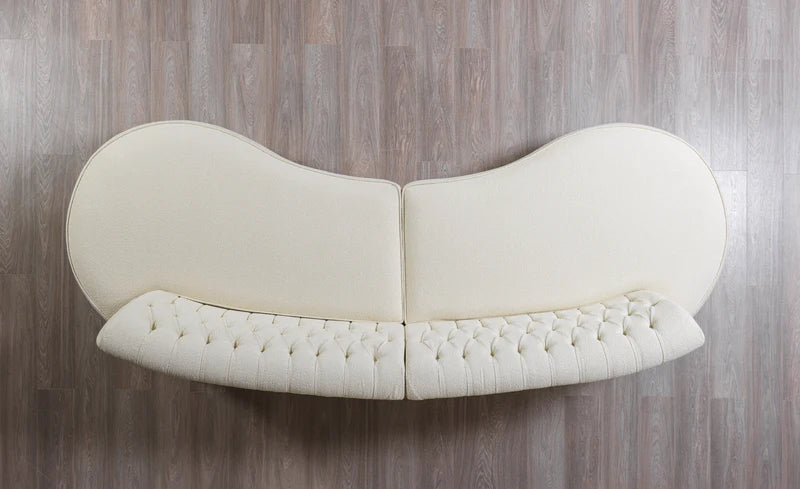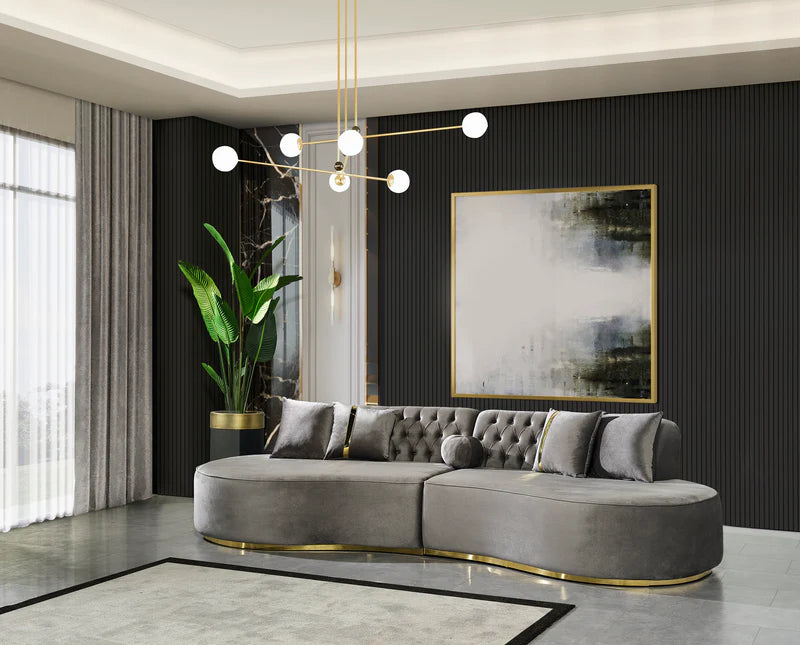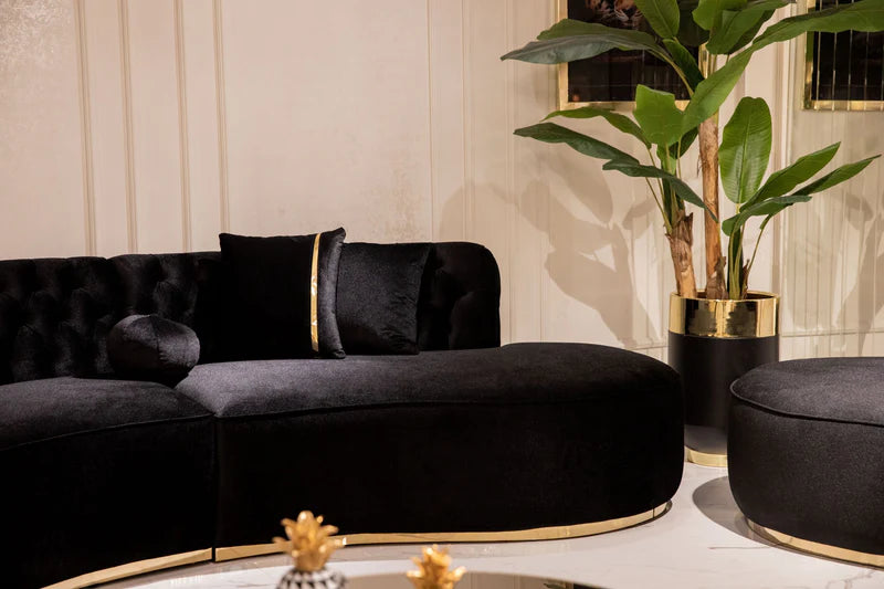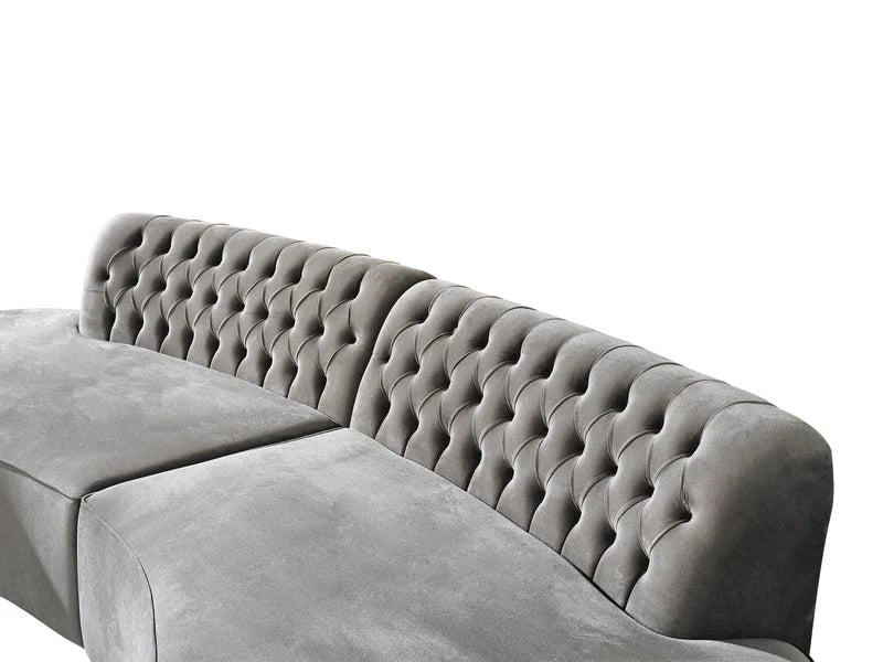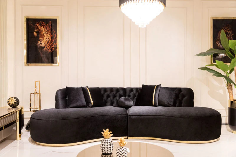 The Ella 2-Piece Curved Sectional is a masterpiece of craftsmanship, showcasing premium velvet upholstery and exquisitely handcrafted deep button tufting. The base of the chaise lounge is adorned with an eye-catching gold detail, infusing your space with a sense of luxury and glamour. Designed with a graceful curved silhouette, the Ella sectional effortlessly combines elegance and visual sophistication, making it a standout piece for any interior.