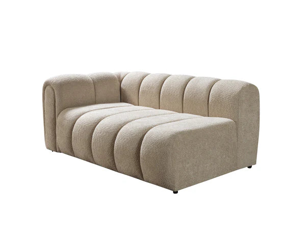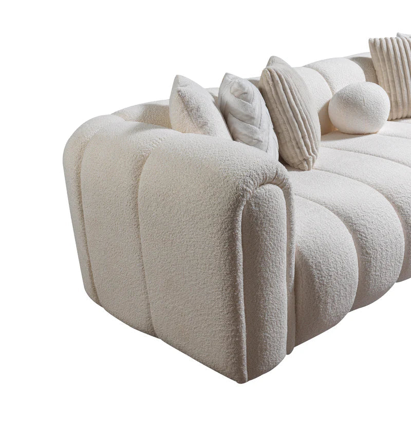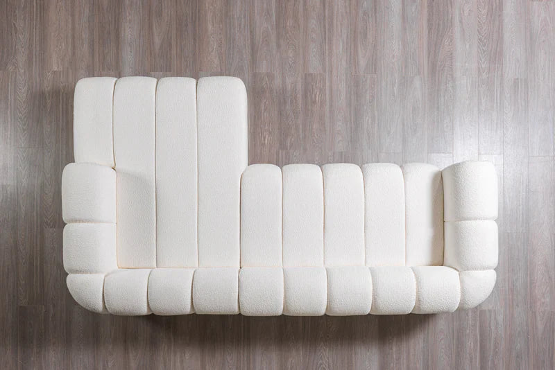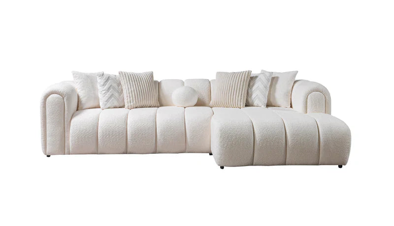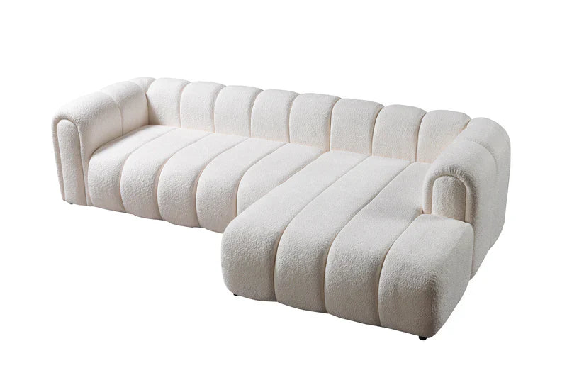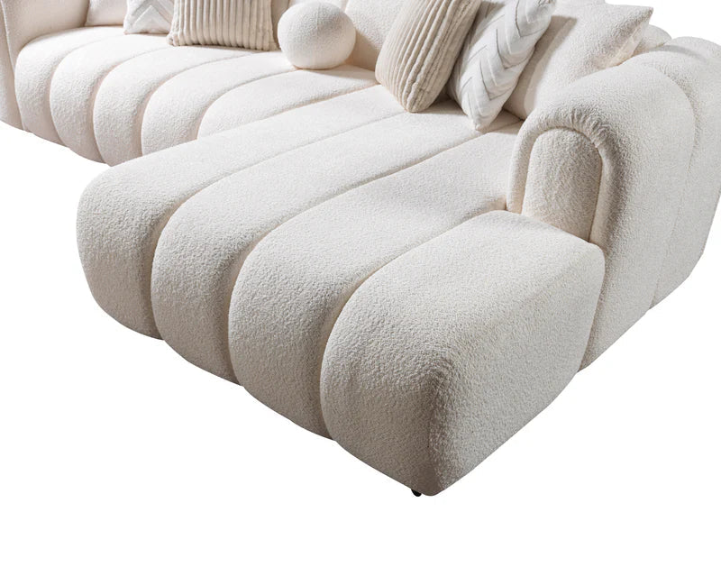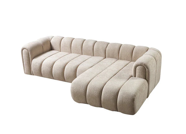 The Lis Bouclé RAF 115″ Sectional blends modern style with luxurious comfort. Wrapped in soft sand-colored bouclé fabric, this spacious L-shaped sectional with a right-arm facing chaise is perfect for lounging, entertaining, or cozy evenings in. Its rounded silhouette and minimalist look suit contemporary and Scandinavian-inspired spaces beautifully.