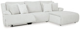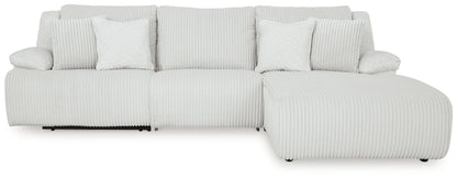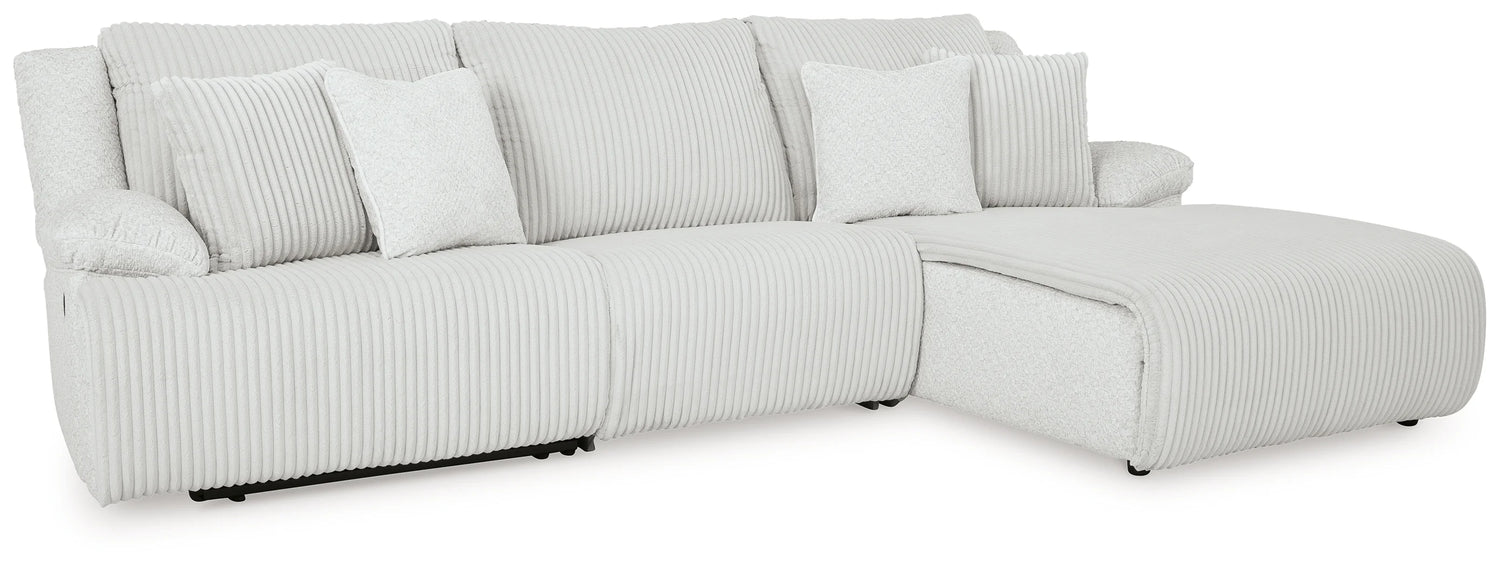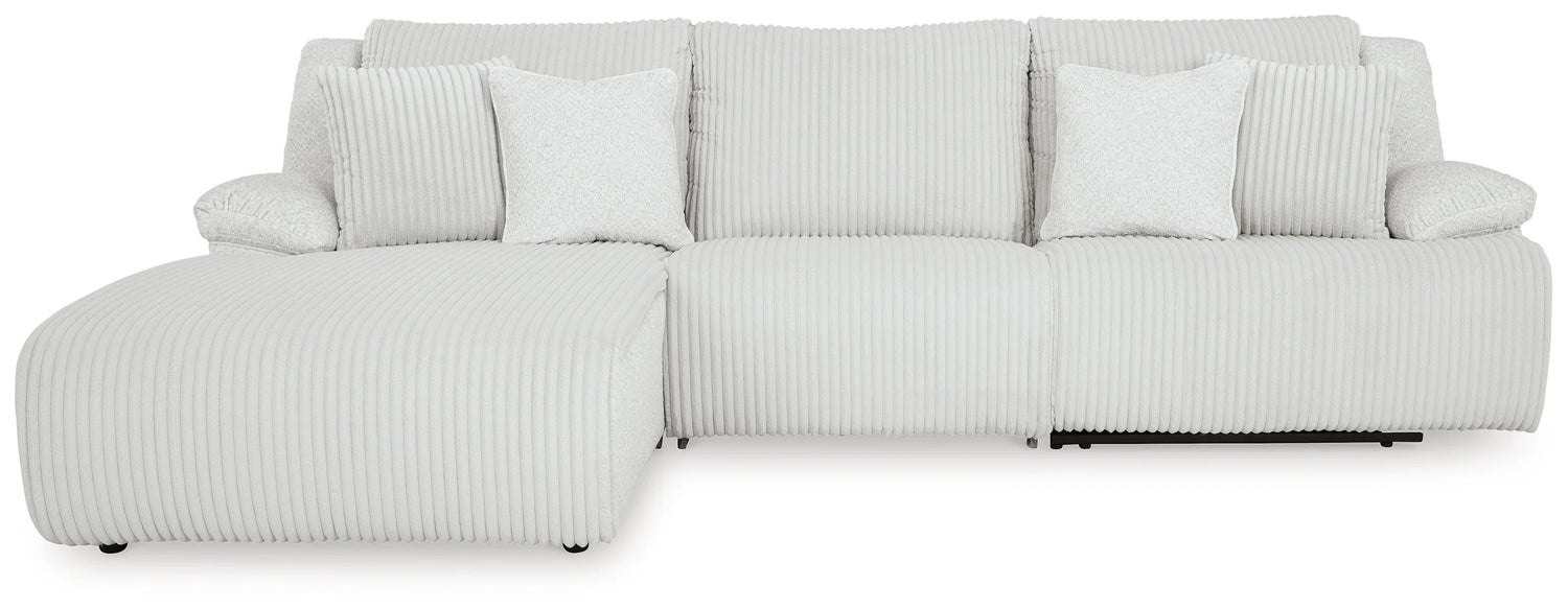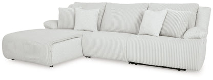 Includes 3 pieces: left-arm facing press back chaise, armless chair, right-arm facing recliner