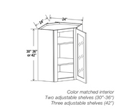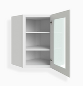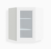 Our 24″ White Shaker Diagonal Corner Wall Cabinet with Glass Door is 24″ wide, 24″ deep, and available in 3 heights – 30″, 36″, and 42″.
