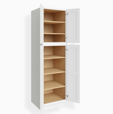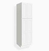 Our White Shaker 24″ W Utility Pantry Cabinet is 24″ Wide, 24″ Deep, and available in 3 heights. This Pantry Cabinet features 2 adjustable top shelves and 3 bottom shelves.
