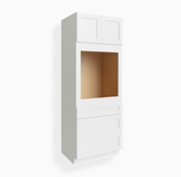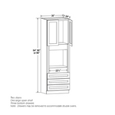 Our White Shaker 30″ W Oven Pantry Cabinet is 30″ Wide, 24″ Deep, and available in 3 heights. This cabinet features two doors, one large open shelf, and three bottom drawers.