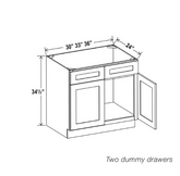 Our White Shaker Sink Base With Double Doors and Drawers is 34.5″ tall, 24″ long, and available in 3 widths (30″, 33″, 36″).